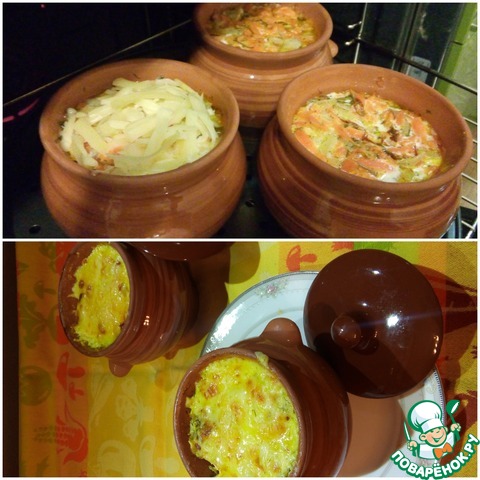 Вкусное блюдо в горшочках с рыбой и рисом.