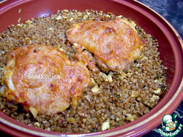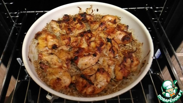 Лук порезать тоненькими полукольцами, чеснок – мелким кубиком. Форму смазать растительным маслом. Выложить в него гречку вместе с водой, добавить лук и чеснок, перемешать и равномерно выровнять по дну формы.