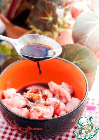 В это время мариную мясо. Смешиваю в миске 3 ст. л. смородинового варенья и 1 ст. л. соевого соуса+ мясо кусочками. Оставляю на 15 минут мариноваться. -