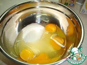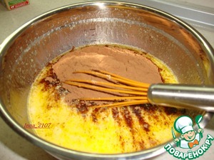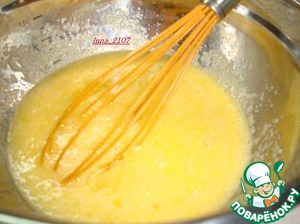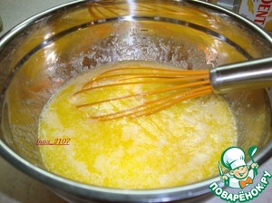 Сливочное масло растопить и остудить. Затем влить его в смесь из яиц и сахара. Добавить молоко. Размешать.