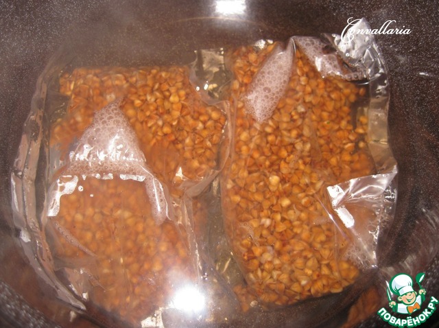 В кастрюле воду довести до кипения, выложить два пакетика гречневой ядрицы и варить согласно инструкции на упаковке - 20 минут (по желанию воду подсолить).
