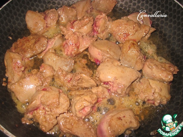 Куриную печень промыть, убрать пленку, нарезать на кусочки. Печень равномерно обжарить на сковороде с разогретым растительным маслом, примерно 6-7 минут.