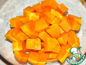 Для начала очистим тыкву и нарежем на небольшие кубики. Зальем небольшим количеством воды и запечем до мягкости. Можно отварить или поставить минут на семь в микроволновку. После этого измельчим ее блендером или протрем через мелкое сито.