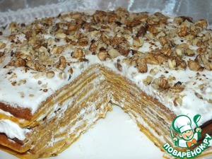 Даем блинам остыть. Аккуратно промазываем кремом каждый блин. Верх украшаем очищенным и измельченным грецким орехом.