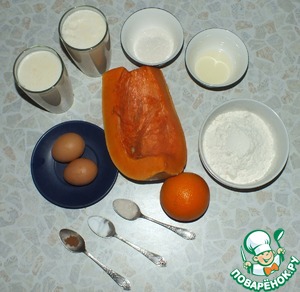 Подготовим все необходимые ингредиенты. Для выпечки лучше брать бутылочную тыкву, она ярче и слаще и, соответственно, даст более глубокий оранжевый цвет блинам и сладость.
