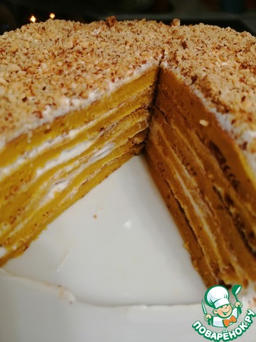 Этот нежный торт понравится даже отъявленным тыквофобам. Вообще тыква хороша тем, что вкус у нее абсолютно нейтральный. Если запечь ее с чесноком, она будет пахнуть пряно и остро. Если перекрутить с лимоном в сырое варенье, впитает в себя цитрусовый аромат. Я хочу предложить рецепт блинного торта с апельсиновой ноткой, который подарит солнечное настроение даже в пасмурную погоду. P.S. Это мой первый опыт размещения рецепта на сайте Поваренок, поэтому надеюсь на вашу снисходительность к моим возможным ошибкам.