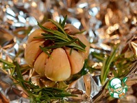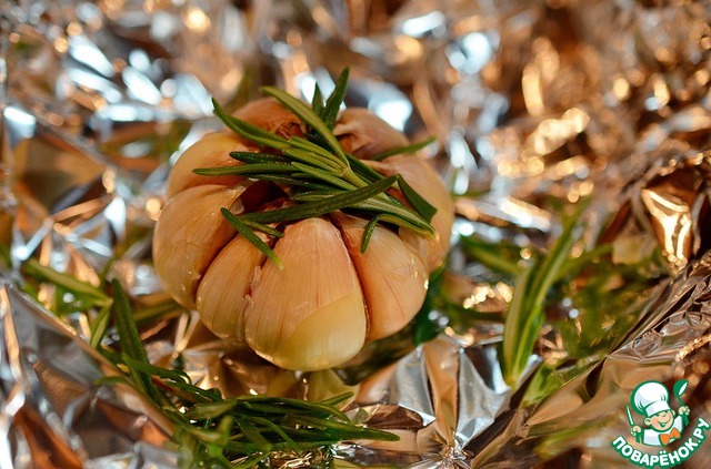 Между дольками положить листики розмарина. Завернуть неплотно и убрать в духовку на 25 минут. До размягчения чеснока. |