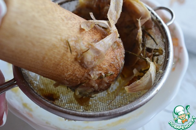 Чеснок вместе с веточками розмарина протереть через сито. |