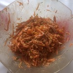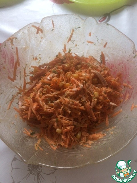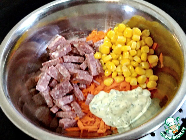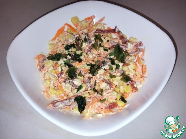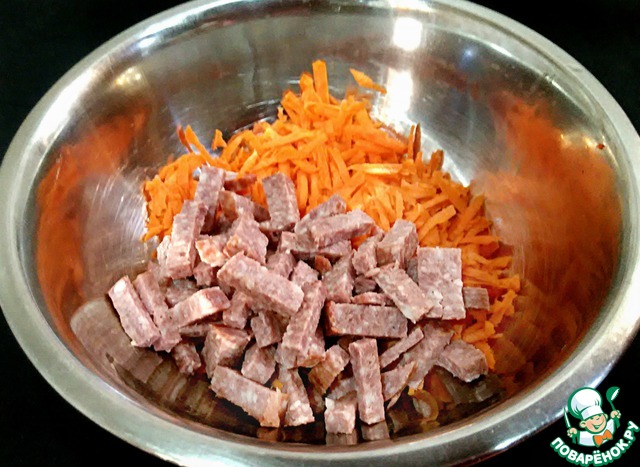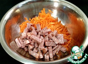 Морковь натереть на крупной терке. Колбасу порезать соломкой. Соединить и перемешать.