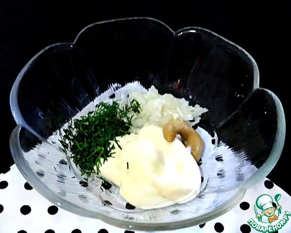 Подготовить заправку. Соединить майонез, измельченный чеснок, горчицу, укроп и все перемешать. По вкусу посолить.