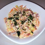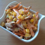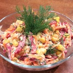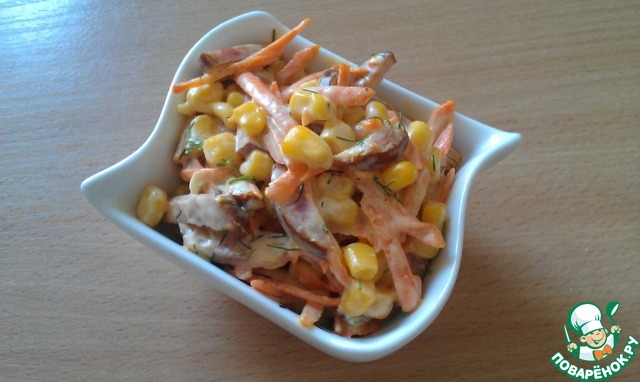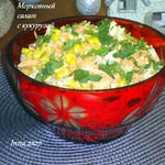 К салату добавить кукурузу, заправку и все тщательно перемешать. Если Вам не достаточно заправки, то добавьте майонез. Я не очень люблю плавающие салаты, поэтому мне было достаточно этого количества. Такой салат становится еще вкуснее, если немного настоится.