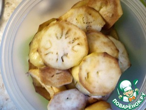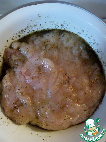 В подготовленную смесь положить отбитые кусочки филе и аккуратно втереть "маринад" в мясо. Пусть помаринуется несколько минут, пока мы занимаемся баклажаном.