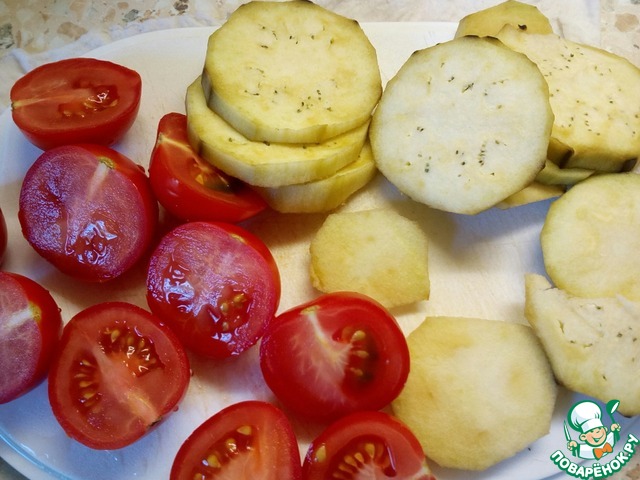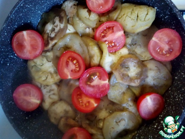 Баклажан порезать кружочками, а помидоры черри на половинки.