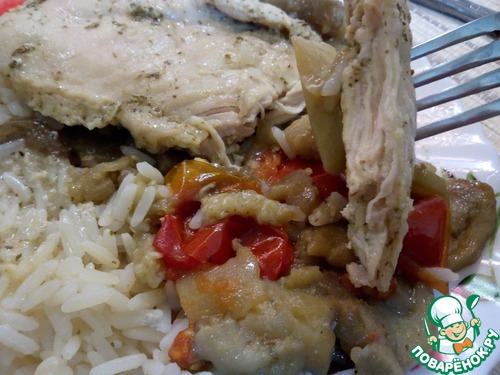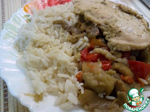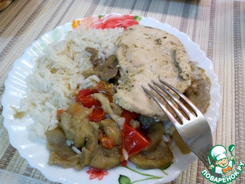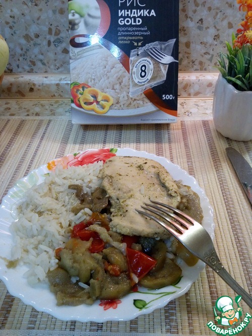 Легкое блюдо на обед или ужин. Нелюбимая многими из-за сухости куриная грудка, приготовленная по этому рецепту получается очень нежной с ненавязчивым медово-лимонным вкусом. Травы входящие в соус отлично дополняют его. Баклажаны и томаты завершают вкусовую гамму. Замечательным гарниром к этому блюду станет пропаренный рис индика голд ТМ "Мистраль". За идею огромная благодарность Жанне (Клио).