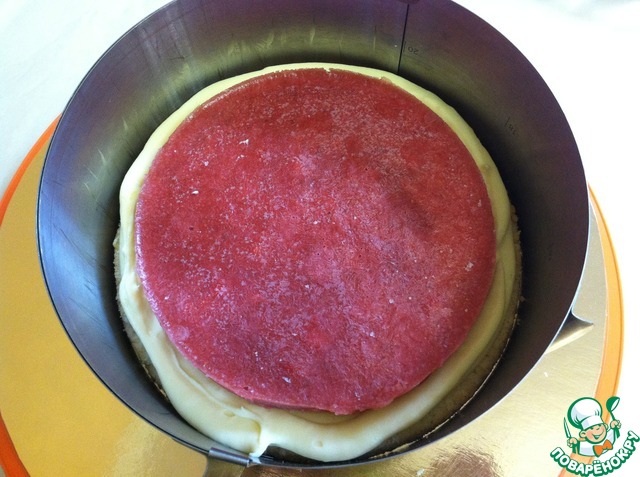 Каждый корж разрезаем пополам. Компоте достаем из морозилки. На дно кладем корж, который потом окажется самым верхним, т. к. мы перевернем форму.