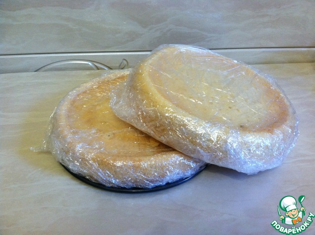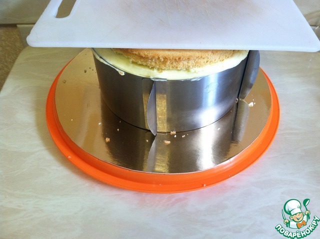 Затем опять кладем бисквит. Повторяем всю процедуру. Верхний корж кремом не смазываем. Укладываем на него разделочную доску и легонько прижимаем. Если место в холодильнике позволяет, то установите сверху на доску небольшой груз, например кастрюльку с водой.