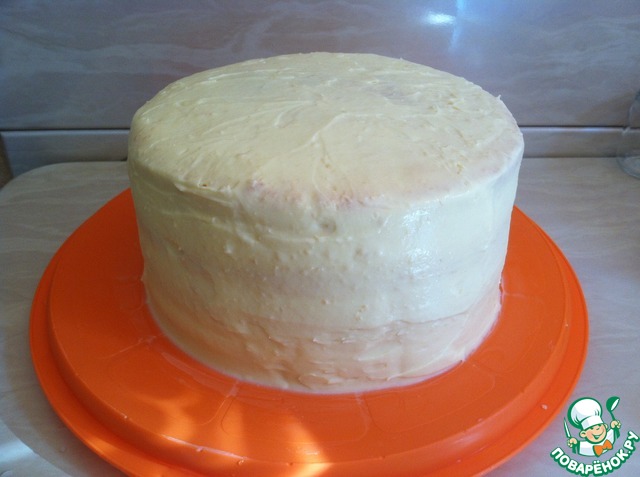 Через часа 2 достаем торт. Аккуратно переворачиваем его (можете этого и не делать) и обмазываем бока и верхушку кремом. Выравниваем. Опять отправляем его в холодильник. Когда крем застынет, вынимаем торт и еще раз обмазываем его кремом, на этот раз так, чтоб коржей уже не было видно.