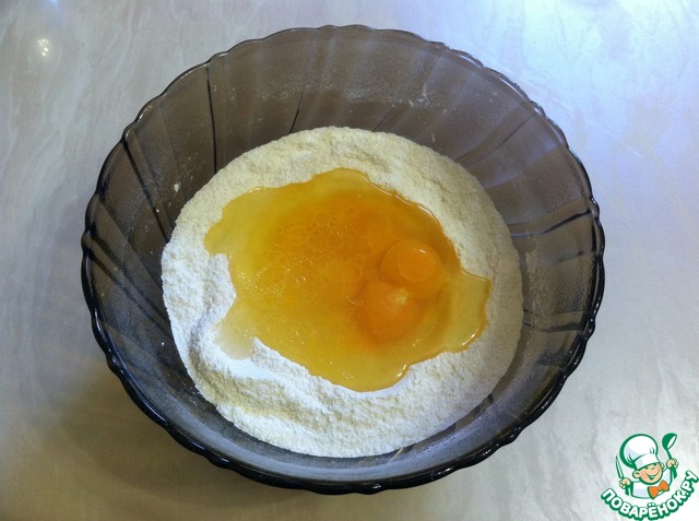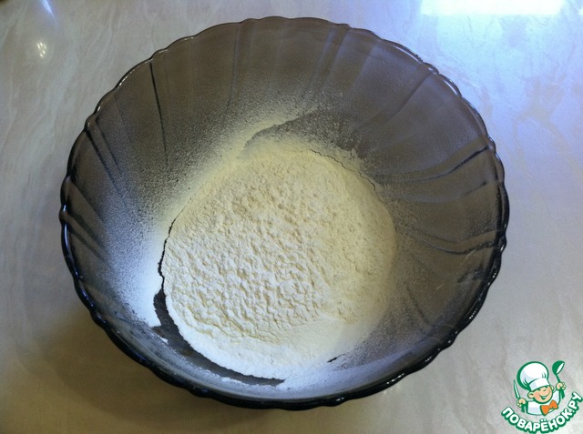 Муку соединить с солью и с разрыхлителем. Просеять. Добавить сахар. Перемешать венчиком.