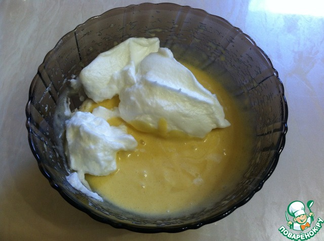 В полученную массу за три приема ввести белки. Белки вводим аккуратно. Замешиваем тесто снизу вверх.