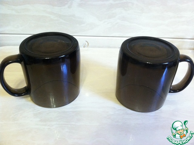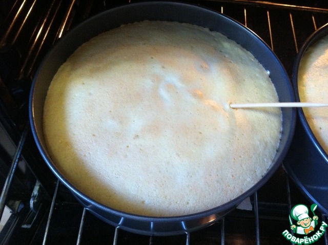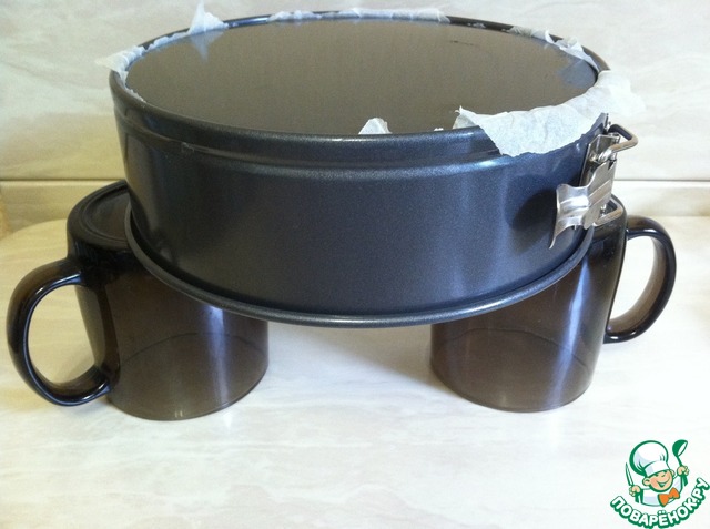 Как только бисквит приготовился, сразу вынимаем его из духовки и переворачиваем форму вниз головой на наши чашки.