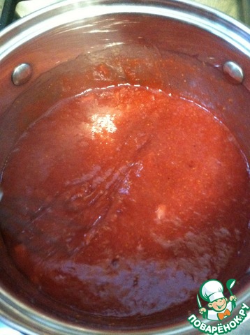 Добавить в кастрюльку клубничное пюре. Еще раз все тщательно перемешать. Добавить кусочки клубники и слегка перемешать. Поставить кастрюльку на средний огонь.