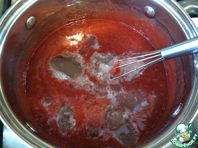 Затем выключаем огонь. Даем пюре остыть несколько минут и добавляем в него желатин. Хорошо перемешиваем.