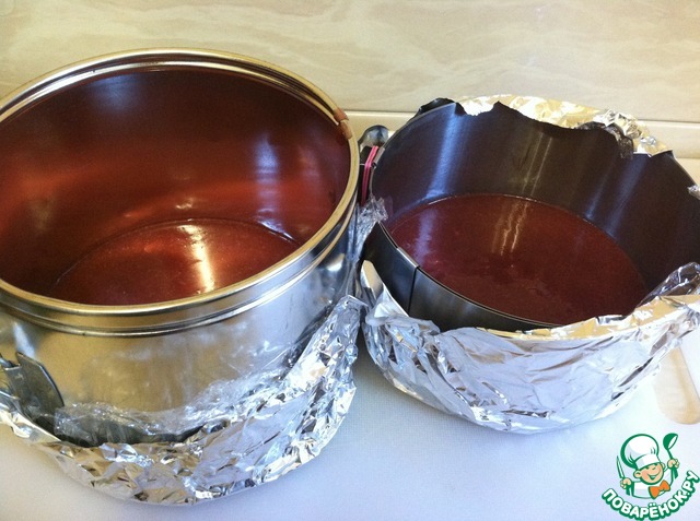 Когда компоте остыло до комнатной температуры, переливаем его в формочки. Формочки необходимо взять меньше (на 2-4 см) тех, в которых выпекался бисквит. Я разделила компоте на 3 части. Дно формочек заранее застелите пищевой пленкой, так будет легче доставать компоте из них. Если вы используете просто кондитерское кольцо, то помимо пленки, укрепите дно фольгой.