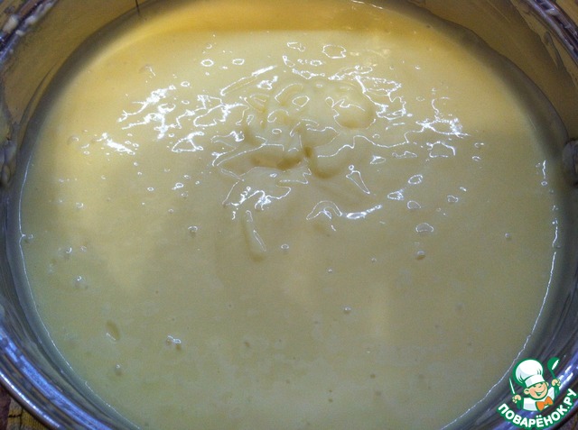 Готовность крема проверяем следующим образом. Проводим ложкой или венчиком по крему и появившаяся дорожка не должна исчезать. Дать крему остыть до комнатной температуры. -