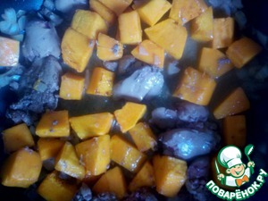 Уменьшаем огонь, закрываем крышку и тушим 5 минут. После чего добавляем обжаренную тыкву. Заливаем приготовленным соусом, доводим до кипения и продолжаем тушение еще в течение 10 минут.