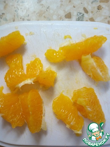 Пока гречка варится, а печень и овощи тушатся, чистим второй апельсин и разбираем его на дольки. Пока чистила, сьела половину.