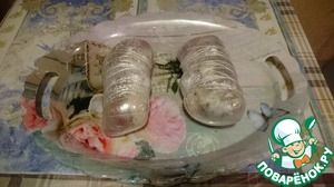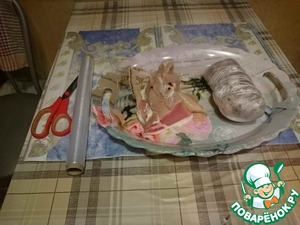 Через 3 дня достаем грудинку из маринада и плотно обматываем пищевой пленкой, стараемся, чтобы не было воздуха, а потом нитками (10-кой белой).