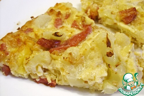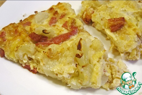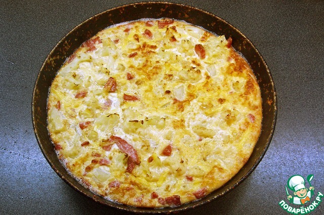Перемешиваем массу ложкой и выливаем на сковороду с обжаренной колбасой. Ещё раз перемешиваем. Масло делим на несколько частей и разбрасываем по поверхности будущей запеканки, и, наконец, посыпаем всё тёртым сыром. Отправляем сковороду в предварительно разогретую духовку и запекаем при 200 град Ц до появления лёгкой золотистой корочки. С подключенным верхнем грилем у меня это заняло не более 5 минут. Вынимаем запеканку и подаём на стол.