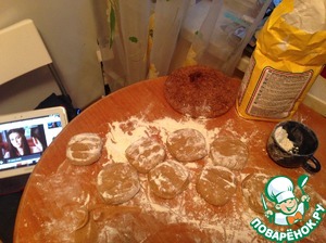 Скатать колбаской и разделить на 8-9 частей. Раскатывать по очереди коржи (стол посыпать обильно мукой, тесто может прилипать и рваться, но это не страшно) и выпекать в хорошо разогретой духовке по 5 мин.