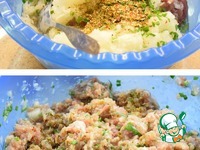 В чашку с фаршем выложить лук, чеснок, порезанную зелень, добавить все специи, соль и хорошо вымешать. Если фарш густоват, то добавить несколько ложек воды. |