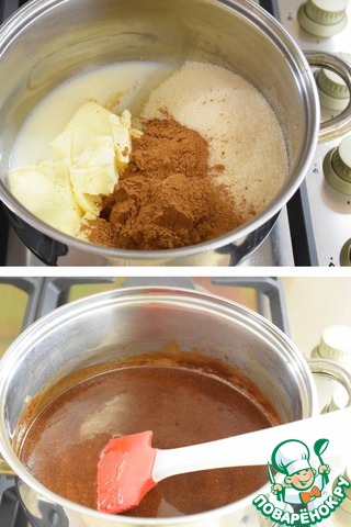 В сотейник выложить сливочное масло, сахар, ванилин, какао-порошок, вылить молоко. Перемешать и дать закипеть на среднем огне, постоянно помешивая. Остудить до комнатной температуры.