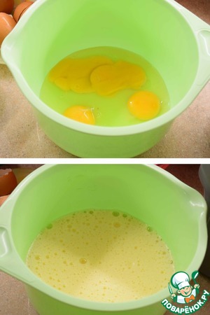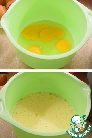 Яйца взбить миксером до увеличения объема в 2-3 раза.