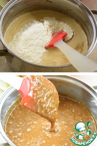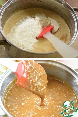 Добавить в 2-3 приема муку, смешанную с разрыхлителем. Аккуратно перемешать лопаточкой. Должно получится тесто кремовой структуры, стекающее с лопаточки.