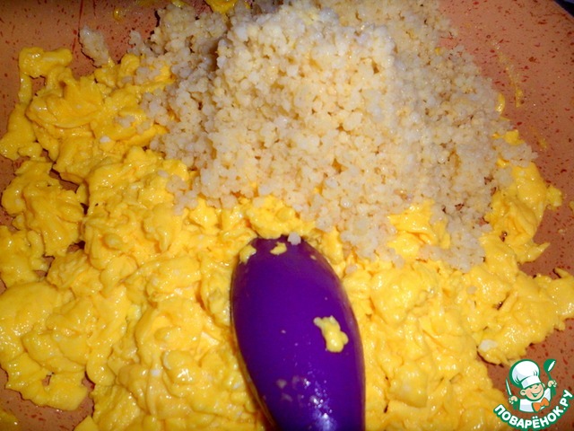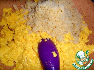 Вынуть пшено из кипятка, дать стечь воде, разрезать пакетик и выложить к яйцам, перемешать.