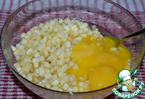 Через час достать яблоки из холодильника (они уже пустили достаточно много сока, и сахар почти весь растворился) и добавить к ним яичные желтки, перемешать.