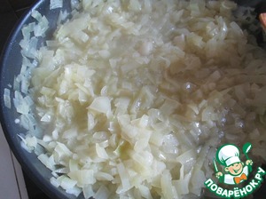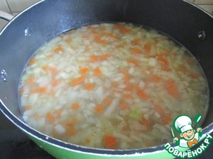 • Лук (600 гр) мелко нарезать и обжарить до золотистого цвета на смеси оливкого (3 ст. л.) и сливочного масла 30 гр. Осторожно, не пережаривать! Под конец добавить 100 мл вина, потомить 3 минуты и добавить всё в бульон.