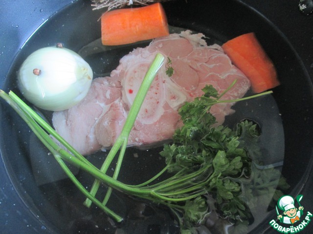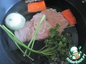 • В кастрюлю налить холодную воду (2 л), добавить мясо (300 гр), 1 лук (в него воткнуть гвоздику 2 шт), очищенную и крупно нарезанную морковь (1 шт.), тимьян, петрушку и лавровый лист. Довести до кипения и варить под крышкой на медленном огне 1,5 часа.