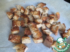 • Тем временем приготовить сухари. Нарезать хлеб (6 ломтиков) и подсушить их в духовке под грилью при максимальной температуре 3-5 минут.