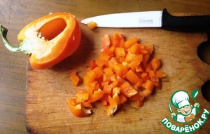 Болгарский перец вымыть, обсушить, удалить сердцевину и нарезать кубиками. Добавить в сотейник к луку.