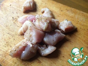 Куриное филе нарезать небольшими кубиками, посолить, посыпать приправой. Перемешать.