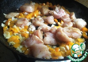 Филе добавить к овощам и готовить до готовности филе. Посыпать куркумой.