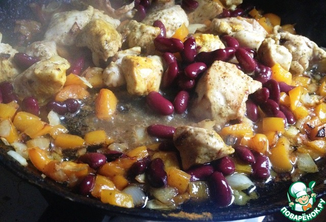 С фасоли слить жидкость и добавить в сотейник. Перемешать. Прогреть.