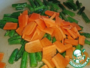 Пока спаржа обжаривается нарезаем морковь, добавляем в сковородку, обжариваем вместе со спаржой.