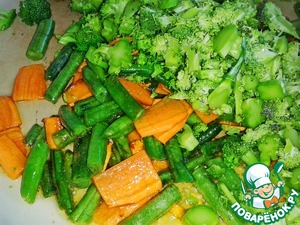 Регулярно помешивая овощи в сковородке, нарезаем брокколи.
