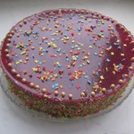 Застывший торт переворачиваем, вынимаем из формы, застёгиваем форму чуть выше, заливаем глазурью- и опять в холодильник. Когда застынет, декорируем низ торта кокосовой стружкой, а верх- по желанию.