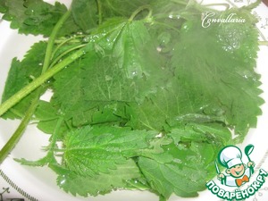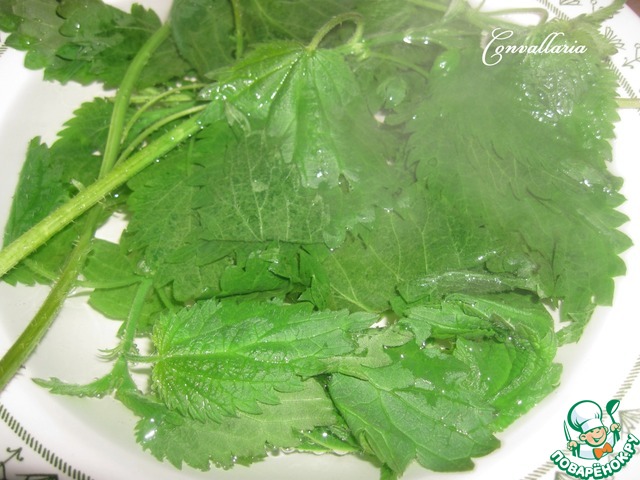 Крапиву залить кипятком на 5 минут. Затем ополоснуть холодной водой и отжать. Отщипнуть листочки (стебли в приготовлении не используются).